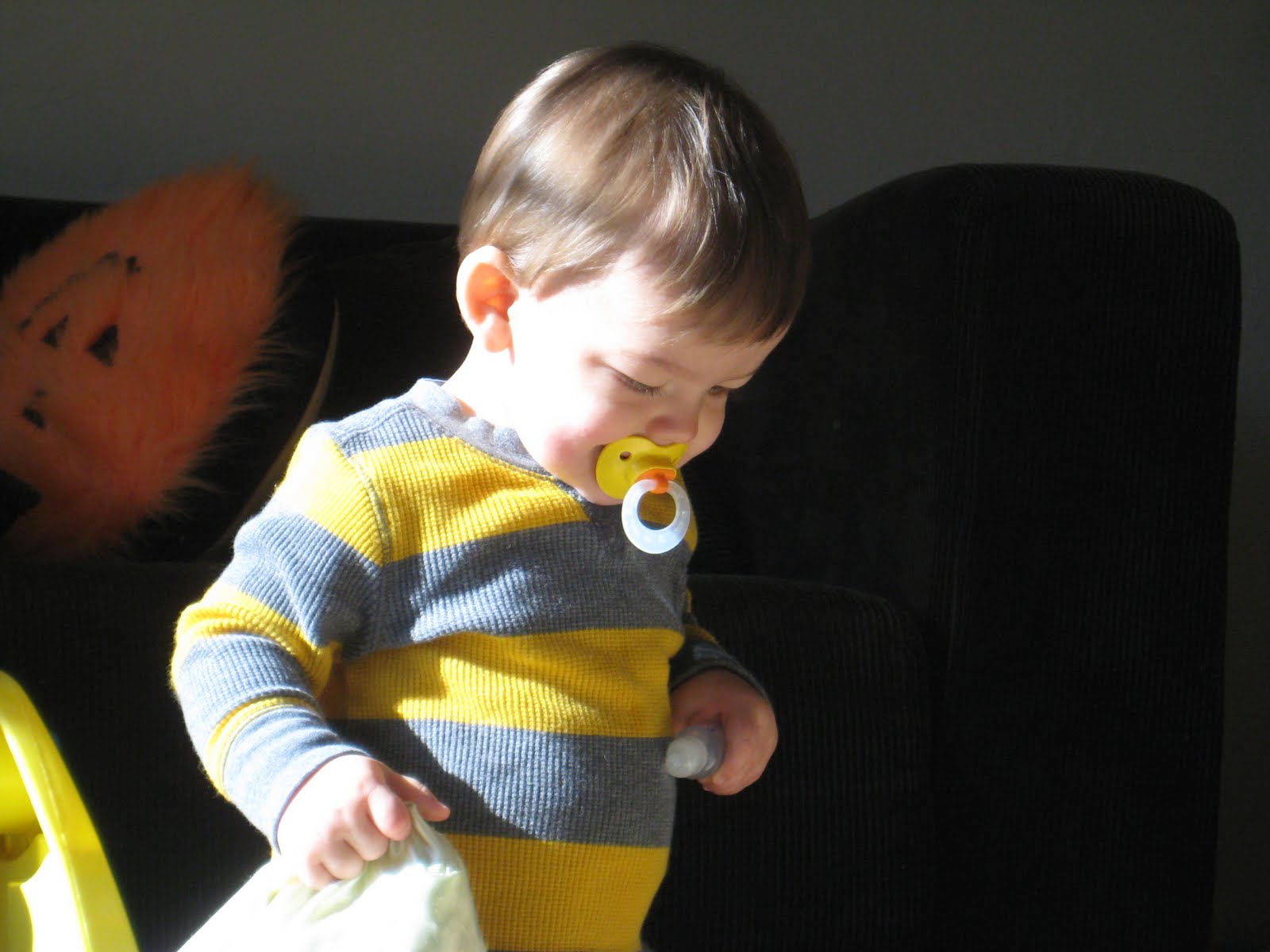 I found Dax one morning in his corner where I keep his toys. He had pulled most of the books off the bookshelf, toys out of the box, puzzles off the racks and was happy as could be. Why do kids like making messes so much?